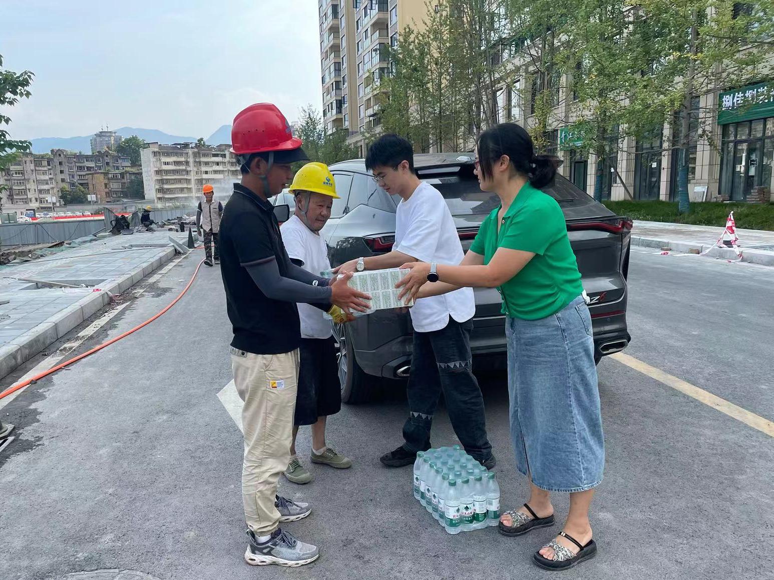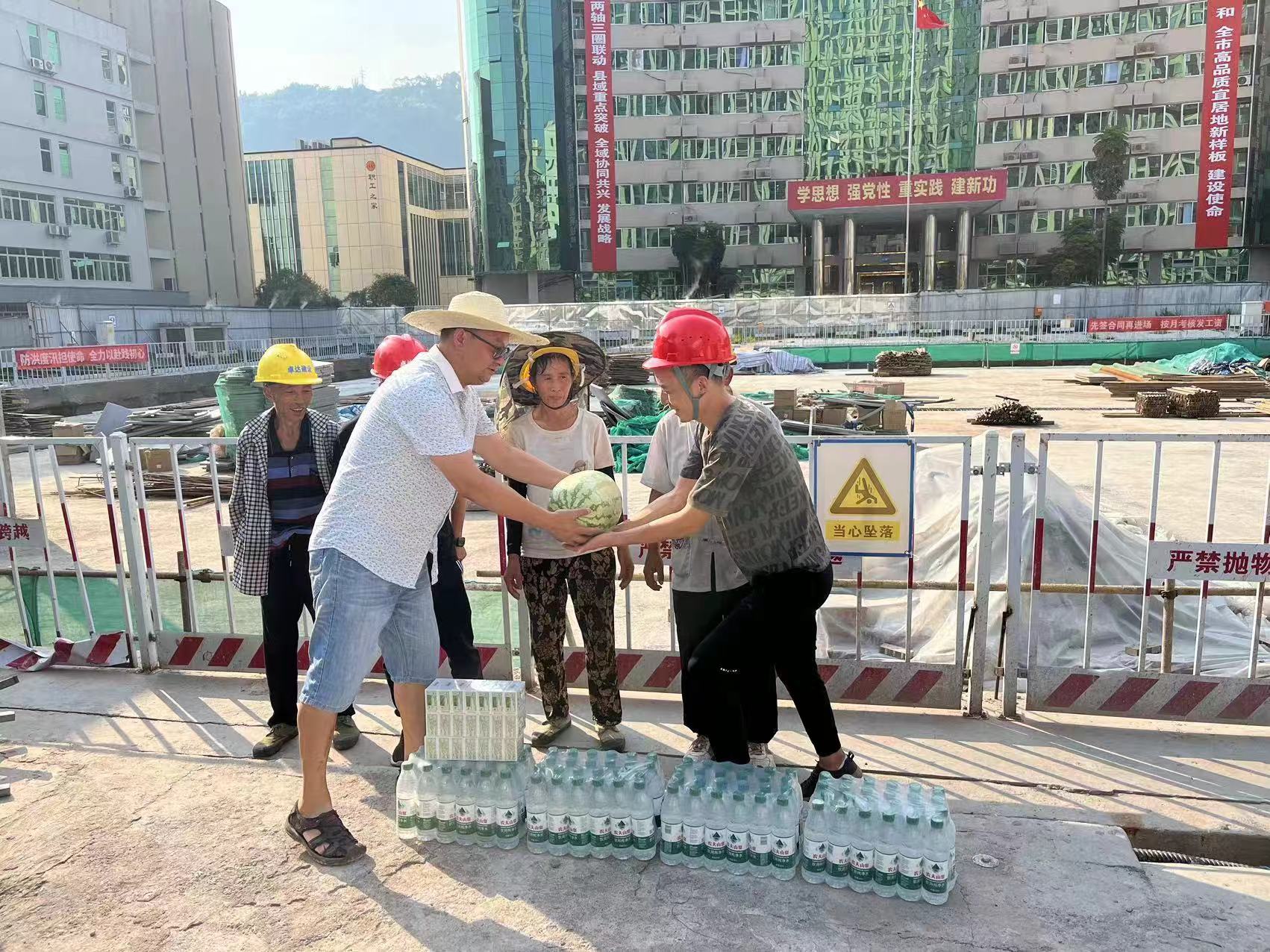 活動(dòng)現(xiàn)場,雨發(fā)展公司相關(guān)負(fù)責(zé)人為堅(jiān)守一線的全體參建人員發(fā)放了礦泉水、西瓜、藿香正氣液等防暑降溫物資。同時(shí),詢問了工人們的工作情況、身體狀況及防暑降溫措施落實(shí)情況,并反復(fù)叮囑大家要合理安排工作時(shí)間,注意勞逸結(jié)合,確保高溫天氣下的施工安全與個(gè)人健康。